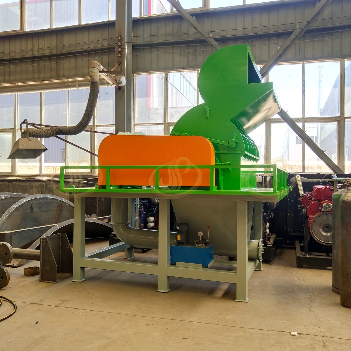 从设备结构看,链板进料、转子、刀具和出料带是**关键的几部分。链板保证不规则木料稳定进入主机,转子承担主要破碎动作,刀具决定木料被切削和拆解的状态,出料输送带负责把形成的木屑或粗料导出。必要时,进料口形式和压料结构也会影响整板和托盘进入主机时的顺畅程度。